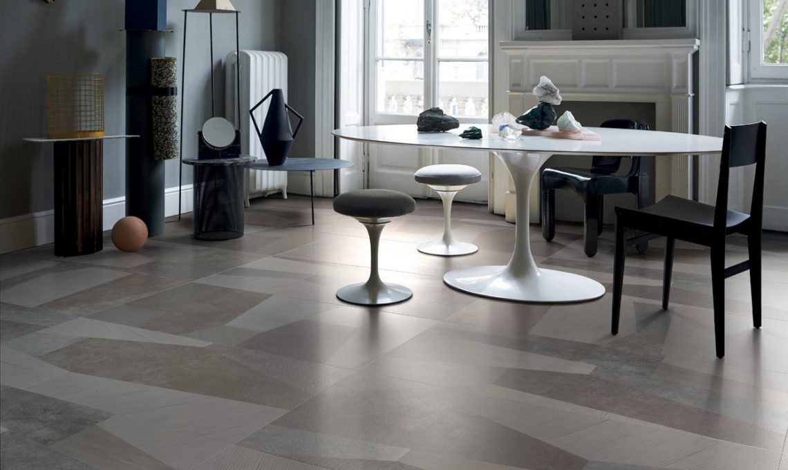Pinto di Studiopepe. Sulle lastre di grande formato (cm 60x60 cm e 60x120) sono accostati materiali diversi per tipologia e natura, come pietre, gessi, cementi, tessuti e legno, sapientemente miscelati in sfumature di colori e mezzi toni. Quattro le famiglie di colore: grigio chiaro, nero antracite, beige e una versione policroma con tonalità pastello. La collezione è completata da tre ulteriori