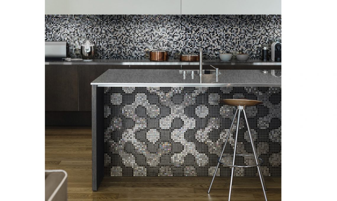 L'eleganza del mosaico nella collezione Botanic Tale, ispirata a un giardino botanico. Una collezione con pattern modulari, che si adattano a piccole e grandi superfici. Le miscele sono composte da tessere in formato mm 10x10, dove smalti e vetri con diversi livelli di trasparenza e iridescenza si intrecciano e si mescolano. In foto, il decoro Koke Black [Mosaico+].