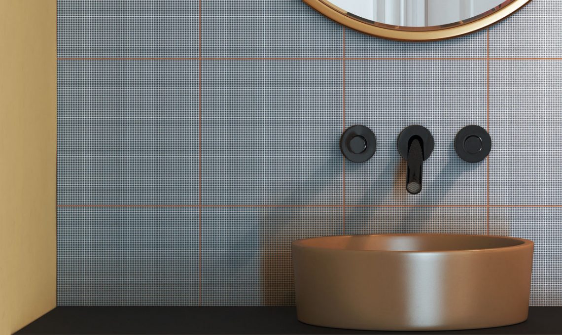 Di grande effetto la collezione Metrica. Mosaico in mono presso cottura, premontato su rete da cm 30x30. Gli elementi geometrici - Cerchi, Incroci, Trattini e Parallele – creano un originale ritmo decorativo sulla parete. Hanno superficie opaca satinata, lucida e metallica [Appiani].