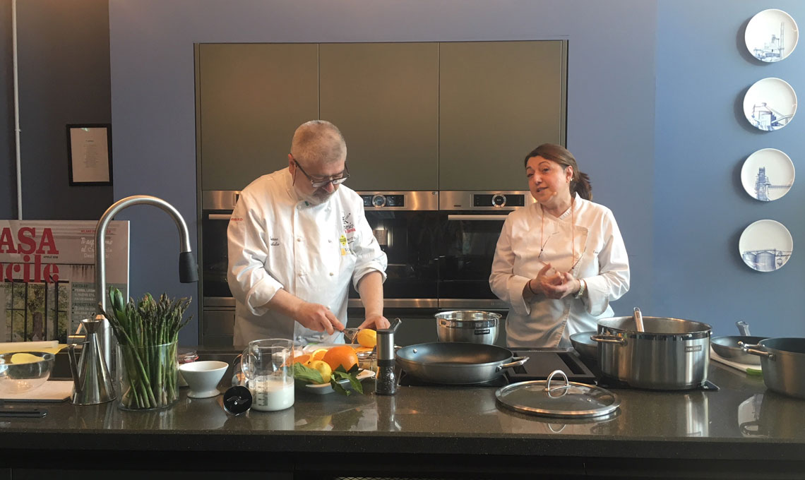 Le ricette? Riso carnaroli con gamberi argentini e agrumi e un fagottino in pasta fillo con ripieno d’asparagi. Colpo di fulmine per il piano cottura di Bosch, a induzione con cappa aspirante integrata nel piano cottura. Soprattutto se abitate in una casa open space, questo elettrodomestico elimina tutti gli odori di cottura. La cappa può diventare un comodo piano d’appoggio e il piano cottura a induzione ha una tecnologia che riconosce il calore della pentola. Insomma, ogni angolo del piano è utilizzabile facilitando la preparazione dei piatti.