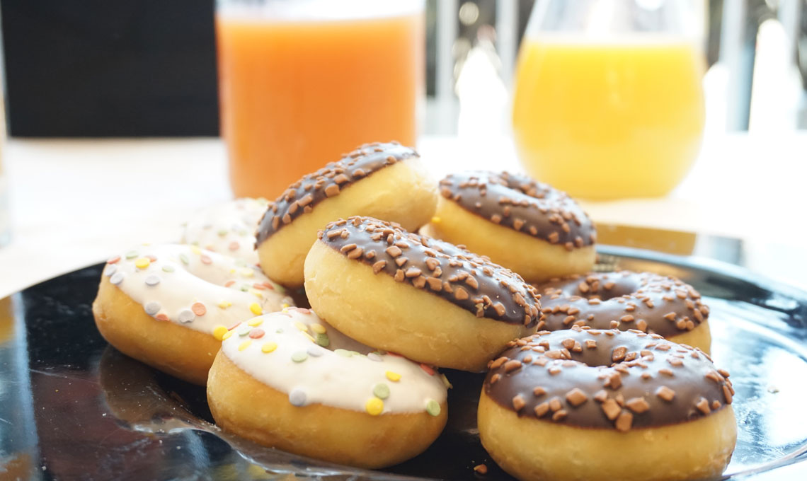 La mattinata comincia con la colazione con il direttore. Mini donuts glassati con codette di zucchero colorate, pasticcini e brioches profumate e appena sfornate. E naturalmente il caffè, quello buono di Vergnano.