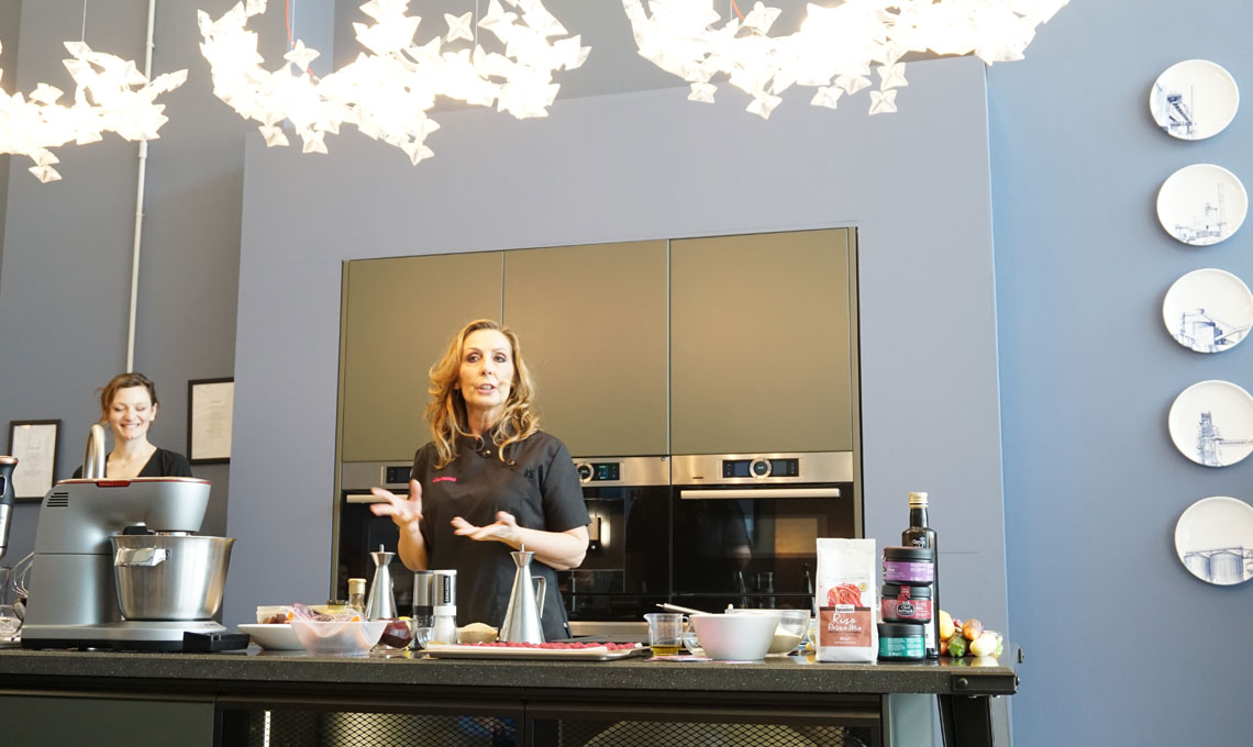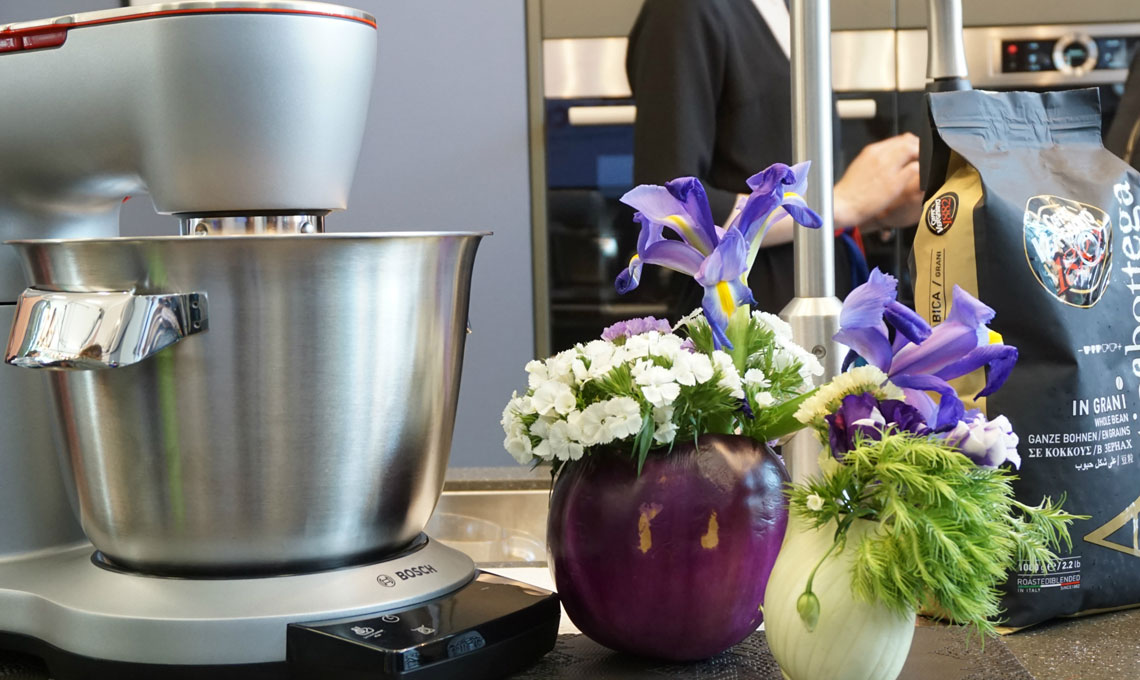 Mentre il filo d’olio in padella sfrigola Elena ci racconta le funzionalità della planetaria Bosch, i segreti della cucina Scavolini e la praticità degli utensili Tescoma.