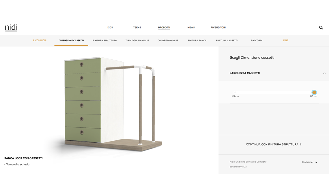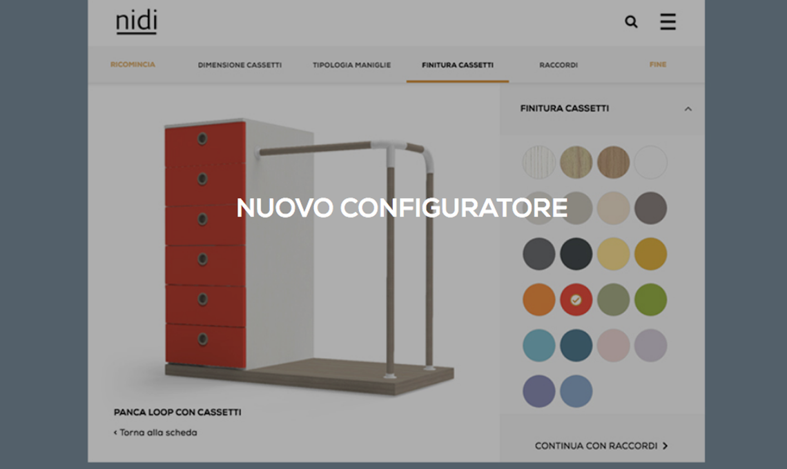 Il configuratore è stato studiato per essere anche un utile elemento di lavoro per il rivenditore. Un’ulteriore esperienza digitale che racconta la personalizzazione, quasi infinita, dei prodotti Nidi.