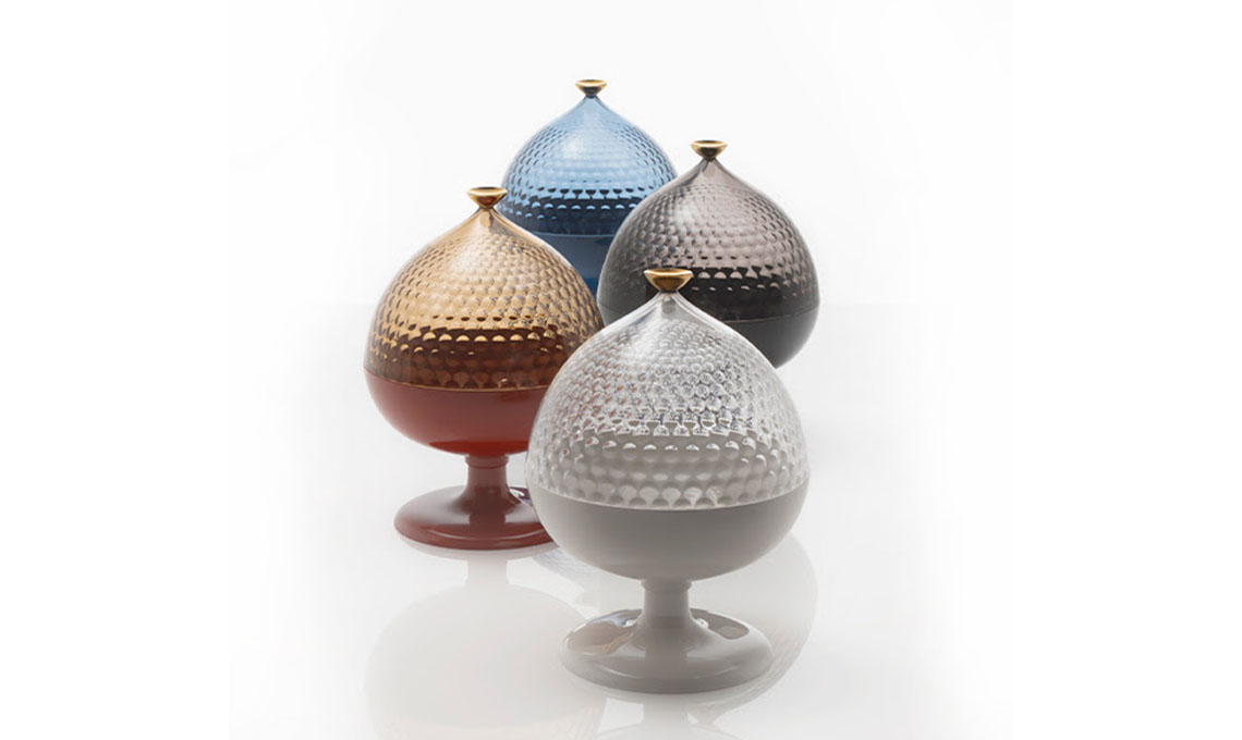 Oggi, insieme a Kartell, presenta appunto Pumo, un moderno contenitore che può essere usato come importante centrotavola, ma anche come zuccheriera o portaoggetti. Disponibile in 4 colori.
