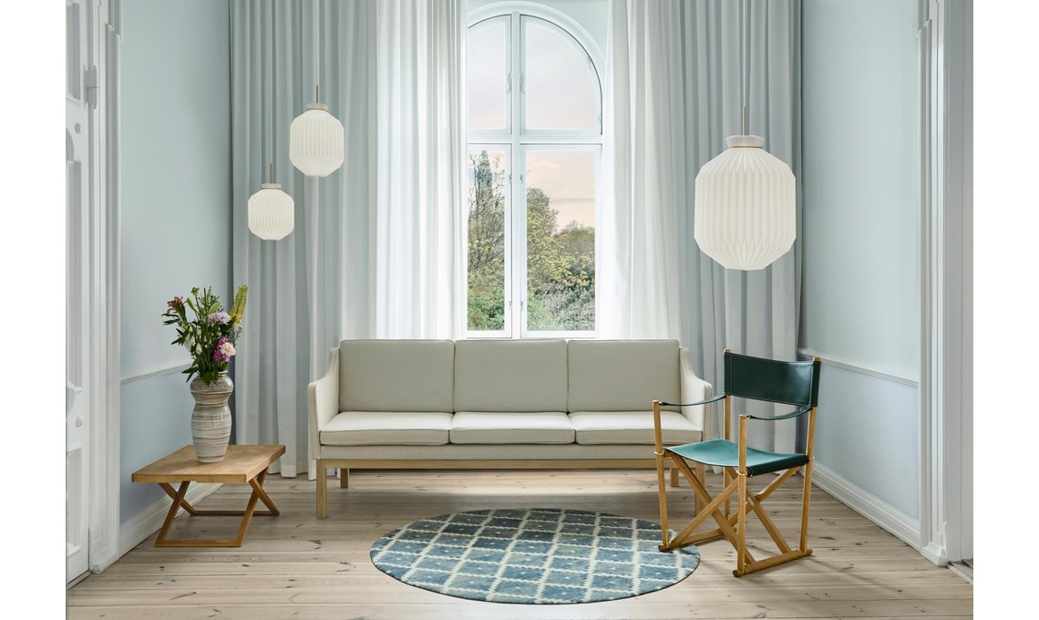 Una lampada senza tempo, che valorizza l’artigianato danese, caratterizzata dalla forma chiusa che occulta la vista della sorgente dal basso e la rende ideale per essere posizionata anche a grandi altezze.