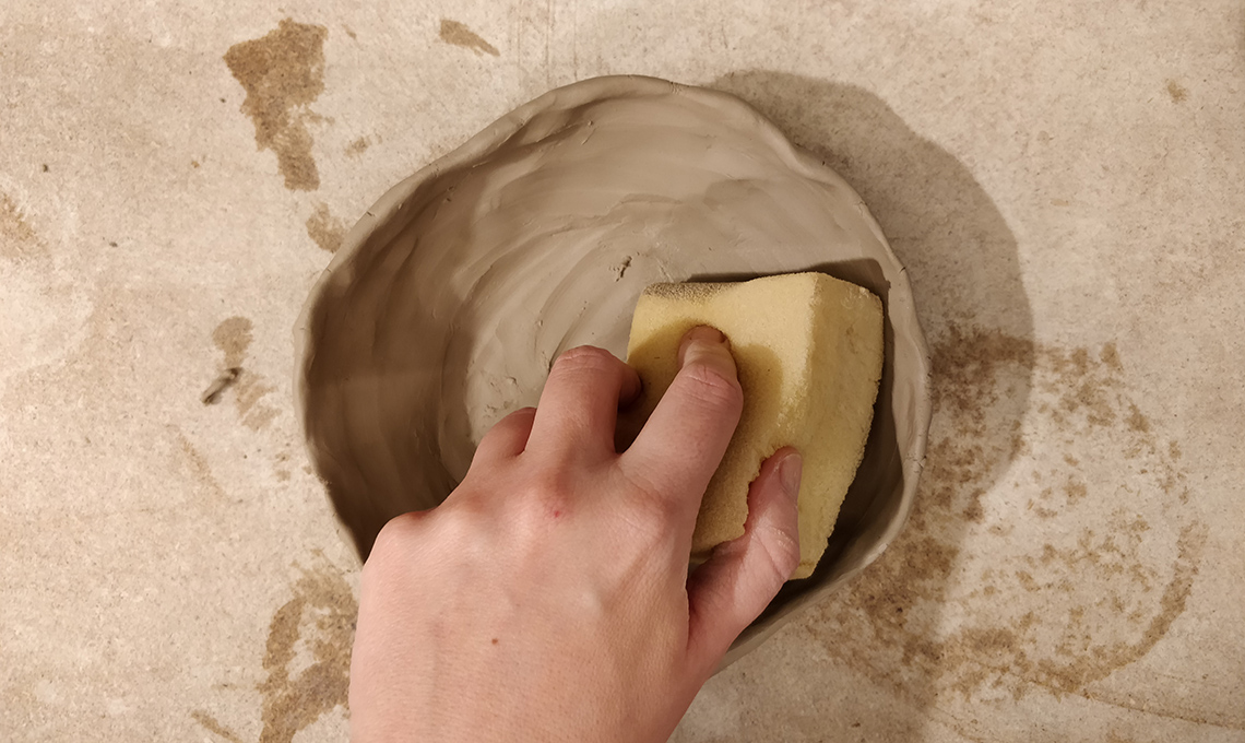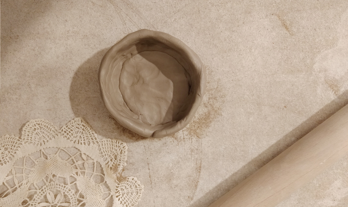 L’argilla tende a seccarsi quindi si può usare una spugna bagnata per inumidire un po' la superficie e poterla lavorare meglio. Strizza bene la spugna, troppa acqua potrebbe andare a compromettere la stabilità del lavoro. - Per decorare si possono utilizzare centrini fatti ad uncinetto, timbri per scrivere delle parole o delle frasi, fiori secchi...