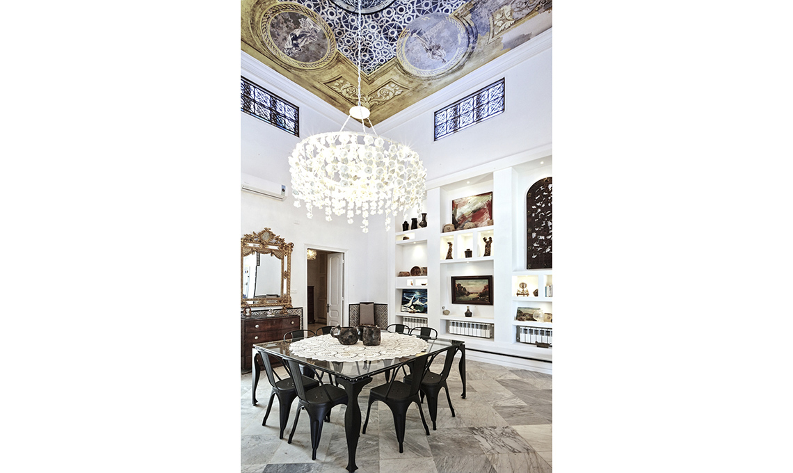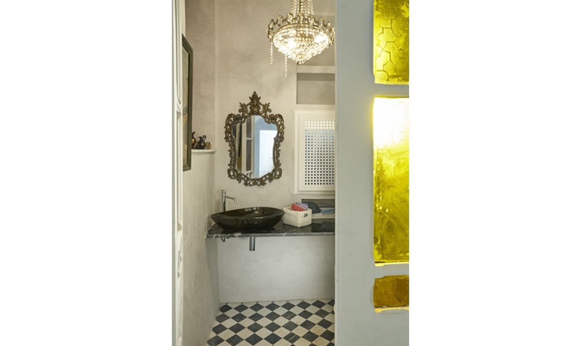 All’interno gli ambienti, ingresso, soggiorno, salone pranzo, camere da letto, sono stati decorati, sia ripristinando i rivestimenti in piastrelle dipinte a mano da artigiani locali sia con rivestimenti murali che lo studio ha disegnato appositamente per questa dimora ma che ha inserito nel catalogo del proprio brand ABITAdecò.