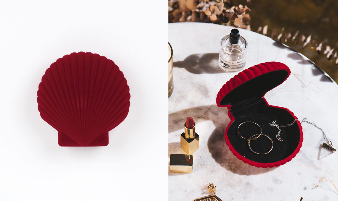 Un portagioie in velluto rosso ispirato a Venere, a forma di conchiglia, per nascondere i tesori più preziosi.