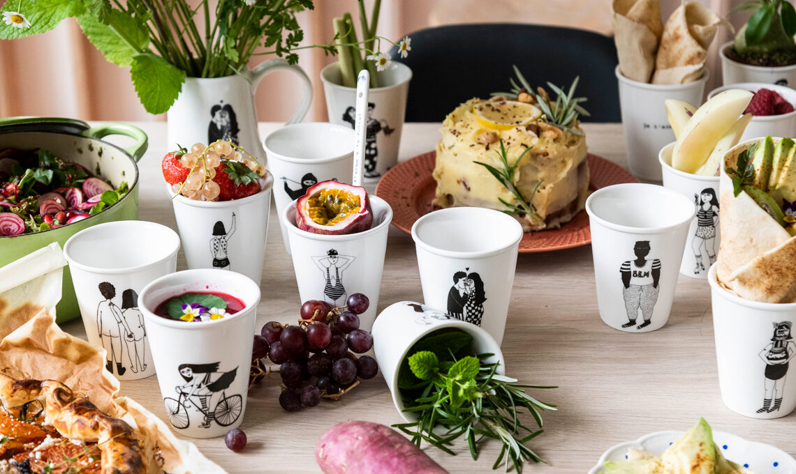 I piatti e bicchieri di Helen B sono fatti a mano e illustrati con soggetti ironici e coppie innamorate.