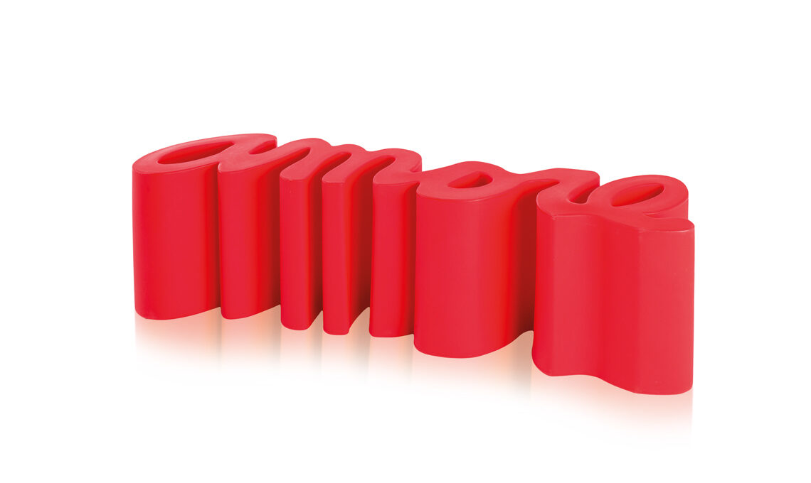 Una panchina romantica, Amore, ideata da Giò Colonna Romano per Slide design: una parola diventa un elemento progettuale e si materializza, trasformandosi in un prodotto capace di comunicare un messaggio. Disponibile in tanti colori.