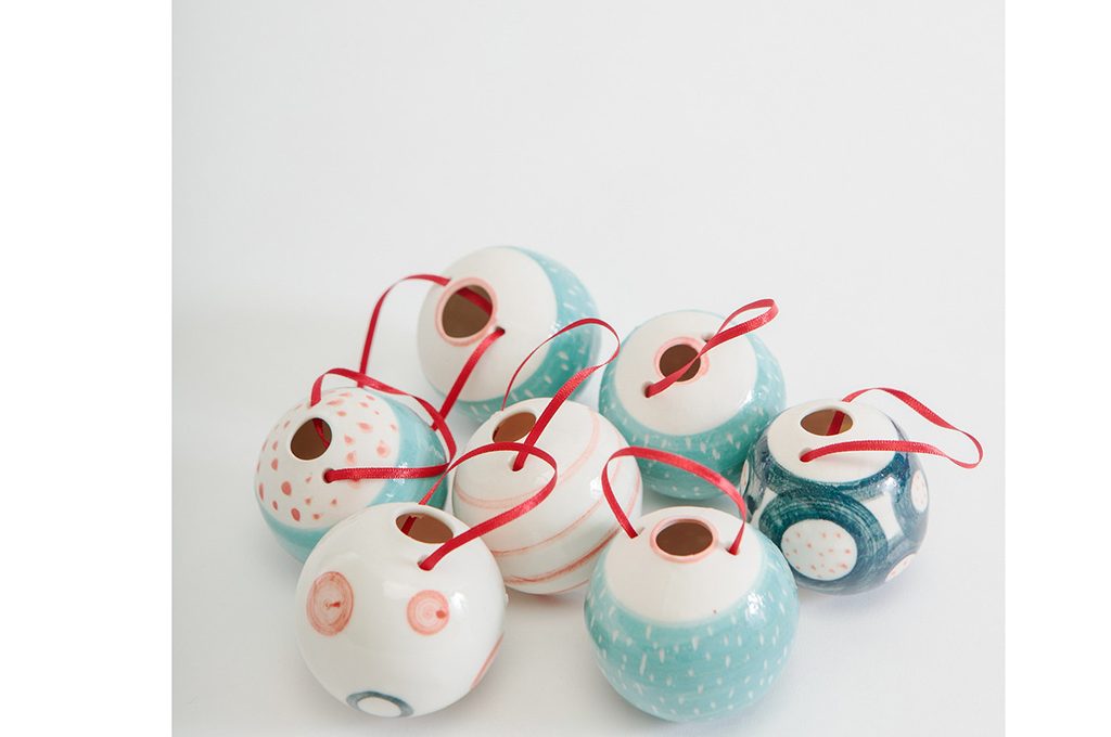Palle di Natale in porcellana bianca fatte a mano e decorate dal ceramista Adam Frew con gli smalti che distinguono il suo lavoro: le sfumature di blu e il color melone [€ 18,50]