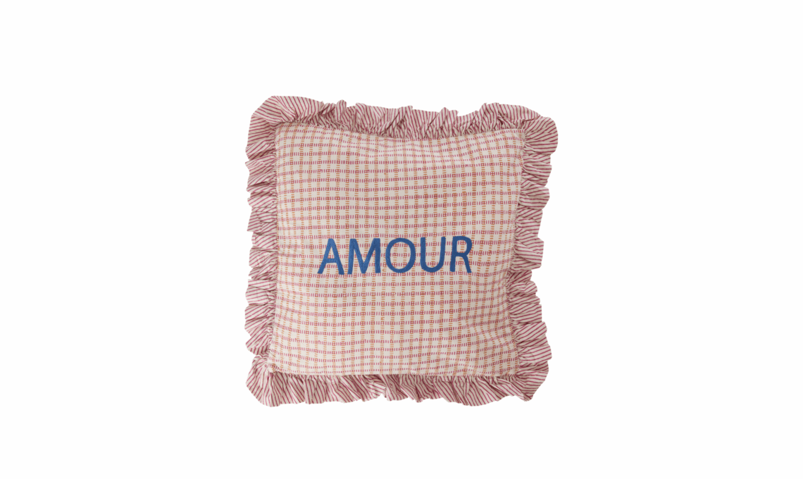 Cuscino in cotone di Rice: perfetto anche per esterno, ha motivo a quadri, allegre balze e il ricamo "amour" al centro.