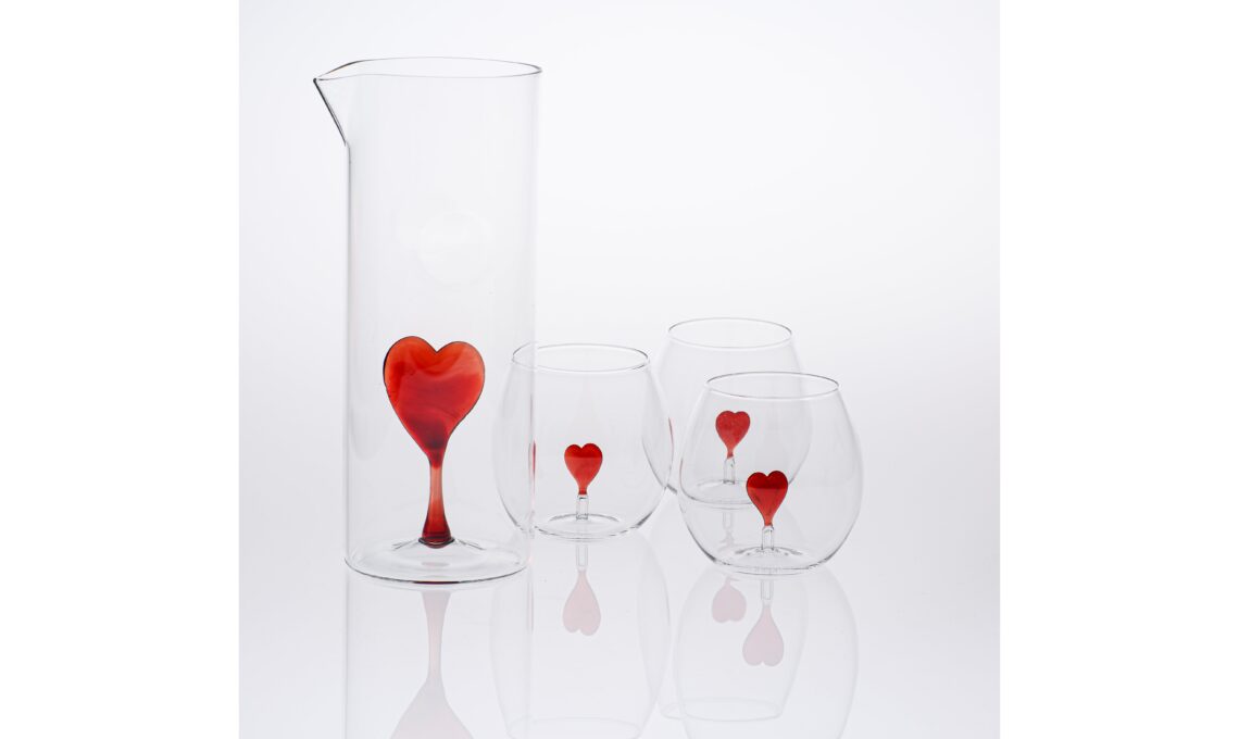 Brocca Sweet Heart di Casarialto: delicata espressione di artigianalità e romanticismo, la caraffa è realizzata a mano a Venezia in vetro soffiato trasparente, con un sorprendente cuore rosso sospeso al suo interno.