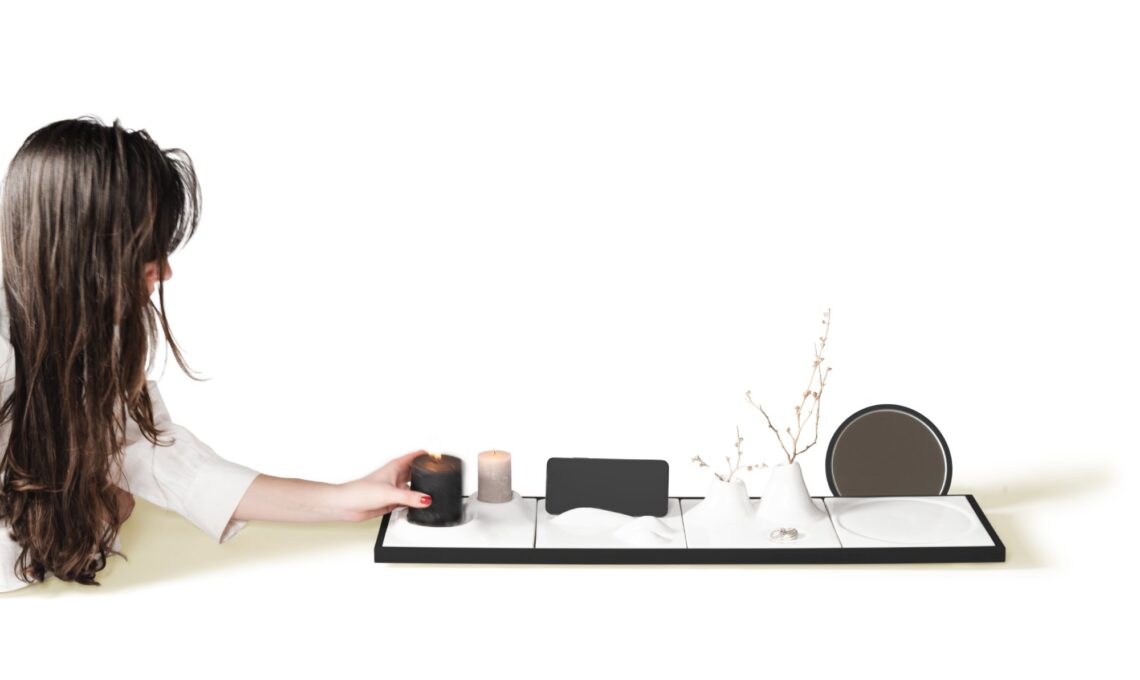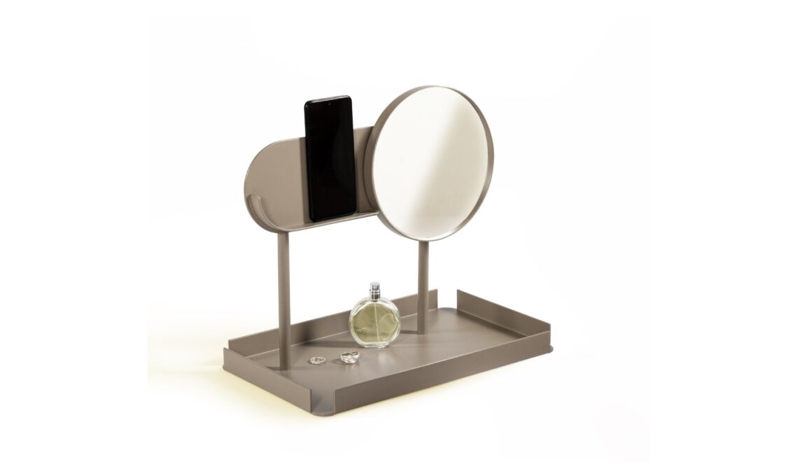 Virgola design Xu Zheng per Orografie: Toletta da bagno composta da vassoio porta-gioie, piano per poggiare lo smartphone e specchio.