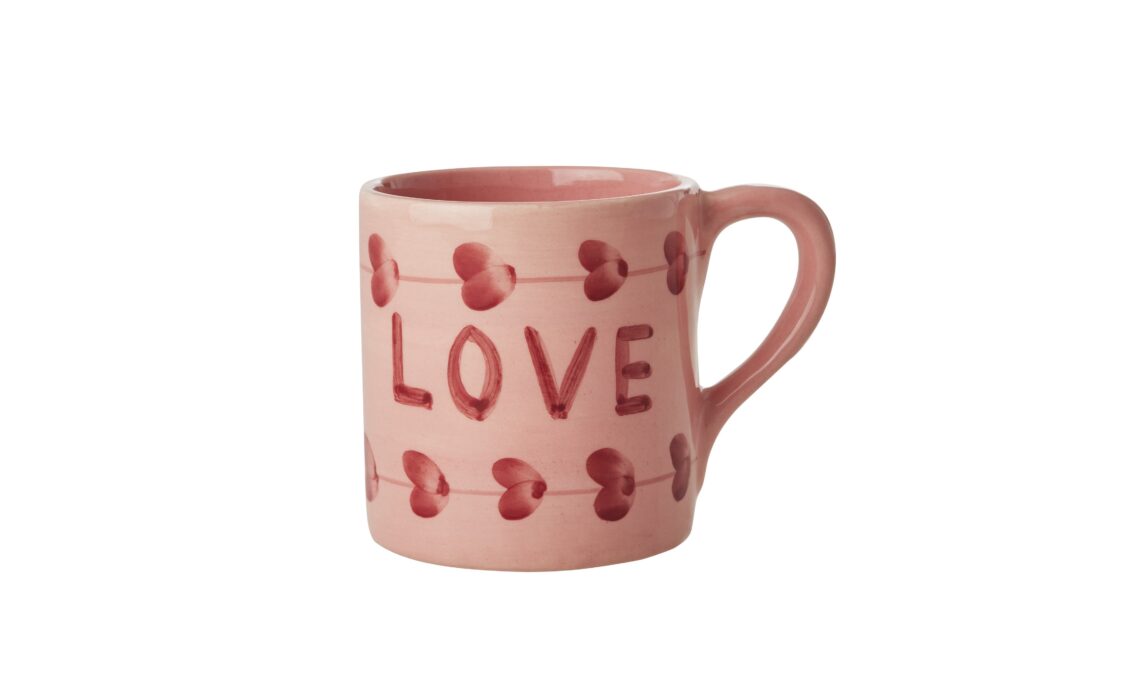 Tazza in ceramica di Rice: simpatica tazza mug da caffè in ceramica con cuori dipinti a mano e la parola "love" scritta al centro. La tazza è dipinta a mano da artigiane portoghesi