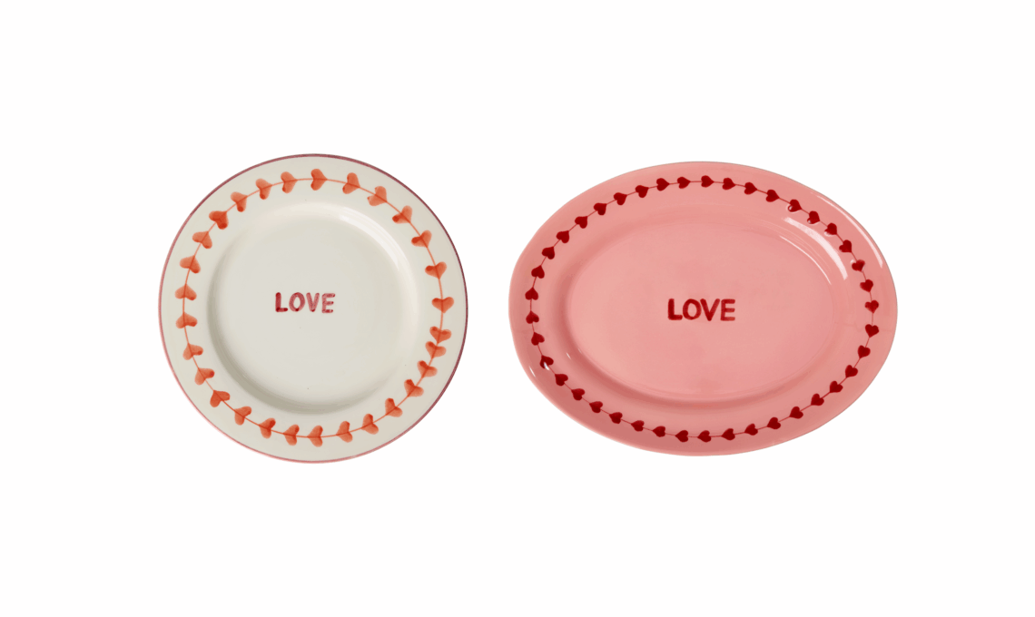 Piatti in ceramica di Rice: piatto da portata rosa con cuori e scritta Love e piatto bianco da torta. I dettagli sono dipinti a mano da artigiane portoghesi.