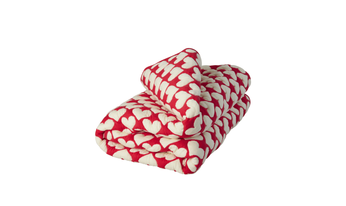 Trapunta con cuori di Rice: morbida e piena di cuori rossi è perfetta per rilassarsi sul divano, per stare al caldo in una serata estiva all'aperto o come copriletto.