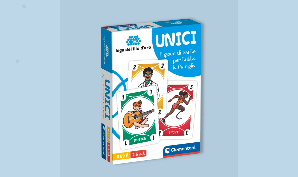 Le illustrazioni delle 100 carte a tema inclusione, abbinate ai numeri e alle carte speciali, aiuteranno i bambini a giocare. Unici sostiene la Lega del Filo d'Oro, a vantaggio delle persone che non vedono e non sentono. https://www.legadelfilodoro.it/it/shop-solidale/regali-solidali/gioco-unici-clementoni-npf