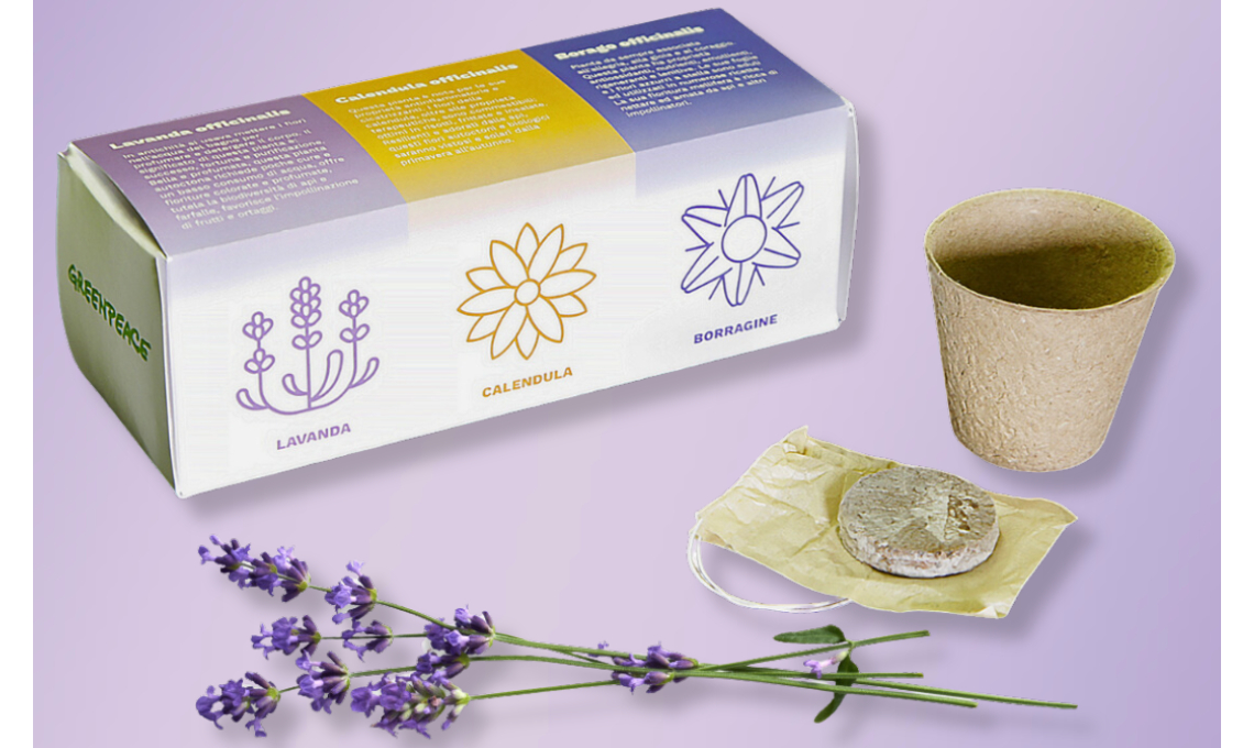 Ogni confezione contiene 3 vasetti completamente biodegradabili con semi biologici e autoctoni di piante “amiche delle api”: Lavanda, Calendula e Borragine. https://shop.greenpeace.it/prodotto/vasetti-semi-fiori-amici-api/