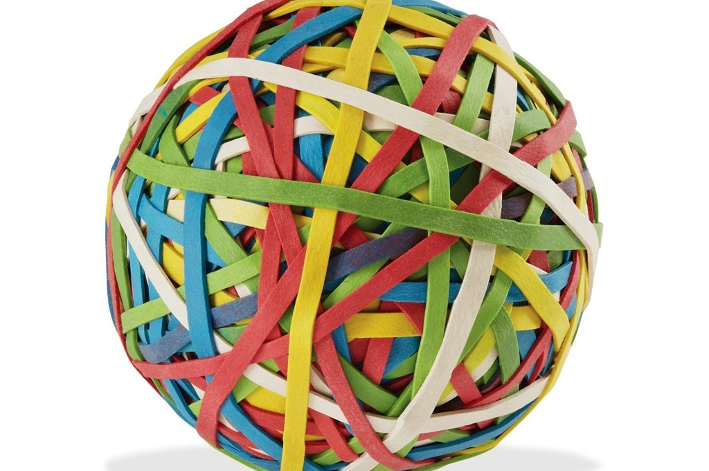 Come tenere in ordine gli elastici? Così, in modo creativo, in una sfera [Moroni Gomma, ø cm 8 €4 l’uno]