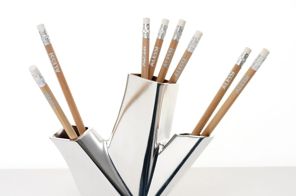 Avveniristico, quasi una scultura da tavolo, il portamatite in alluminio Trina [Alessi, cm 15x8x13h €47]