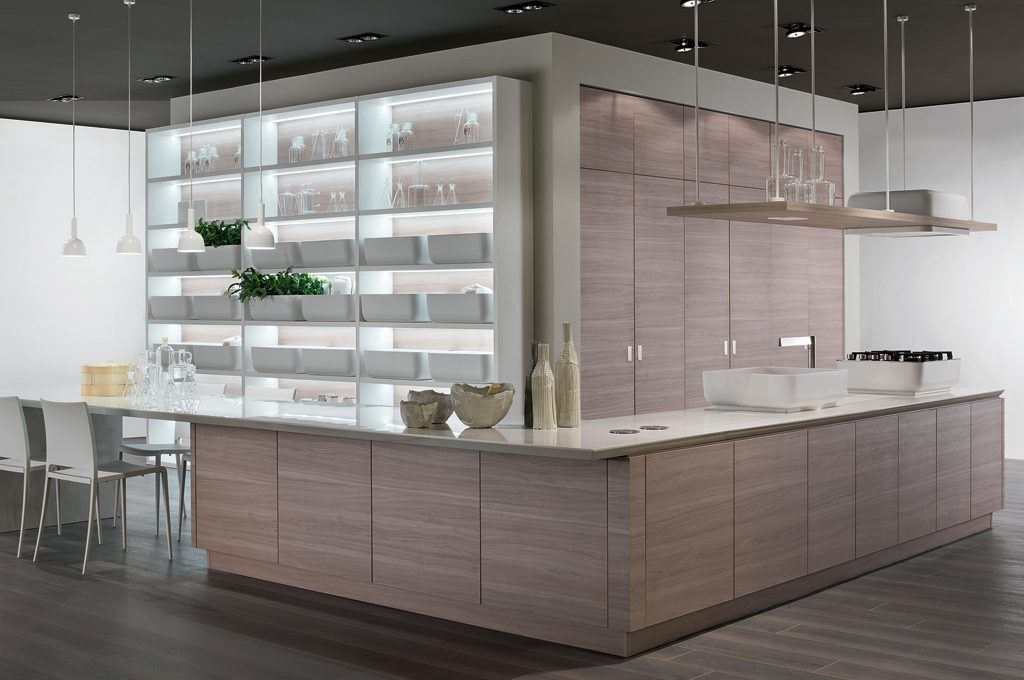La cucina Ki - articolata in composizioni lineari, a isola e penisola - vede i contenitori appoggiati sulle mensole a fungere da pensili, o declinati come lavello e piano cottura.