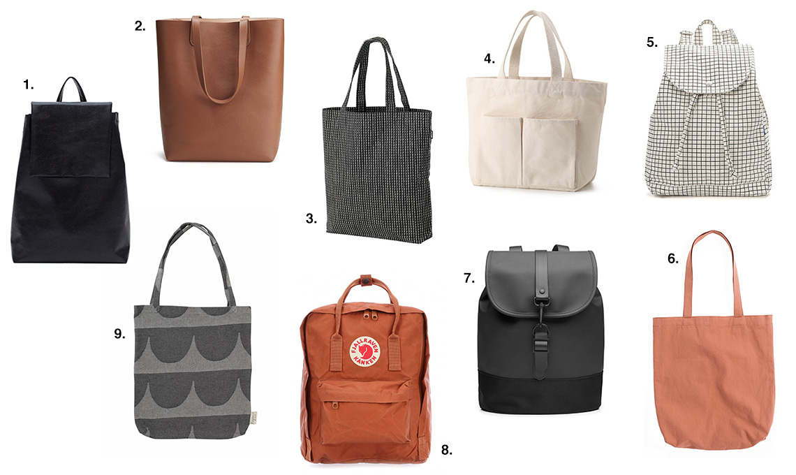1. Zaino in ecopelle BOO [€79] / 2. Tote bag in pelle Cuyana [€192,50] / 3. Tote bag in cotone Artek [€31] / 4. Tote bag in cotone biologico Muji [€12,95] / 5. Zaino in cotone Baggu [€39,50] / 6. Tote bag in cotone Baggu [€14,50] /