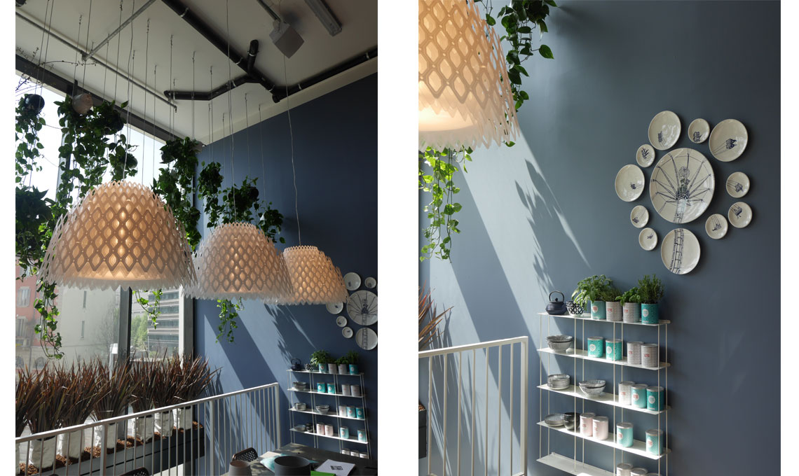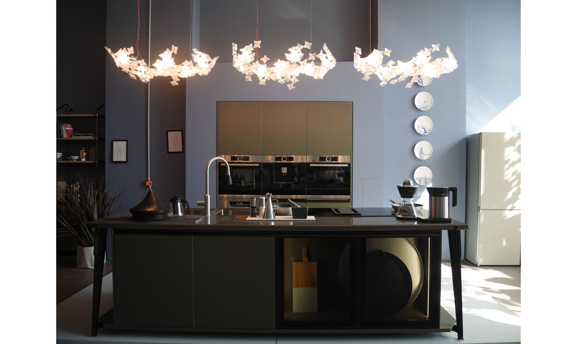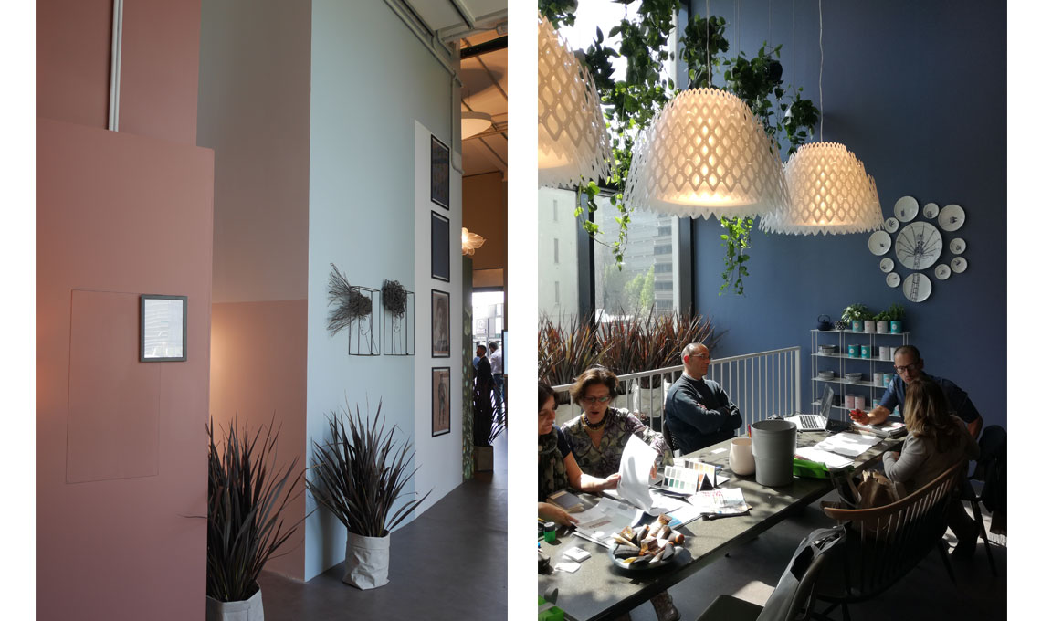 Qui mi ha colpito in primis la luce, protagonista grazie alle grandi vetrate e alle lampade scultoree (tutto Slamp). Tecnologia e design si fondono insieme ai tanti elementi naturali allestiti da Leftygardens con il materiale di Mati 1909 e Orticolario: piante ed alberi nelle zone di passaggio, comuni essenze ricadenti, come il pothos, che diventano originali ed ecologici tendaggi.