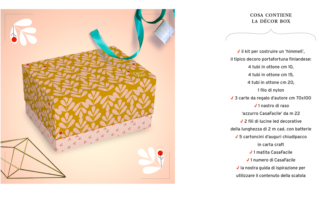 La Decor Box di CasaFacile, in edizione limitata, è la scatola che accende la tua fantasia e creatività: con il suo contenuto potrai illuminare le Feste, realizzare pacchetti natalizi, decorazioni e bigliettini speciali, più un ‘himmeli’ in metallo (il ciondolo per la casa portafortuna della tradizione nordica).