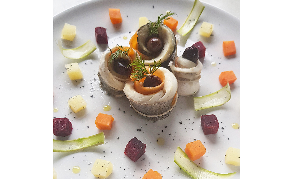 - Sala ogni filetto e aggiungi un nastro di carota e un ciuffetto di aneto. Arrotola e lega tutto con spago da cucina. Aggiungi un'oliva nella parte superiore.