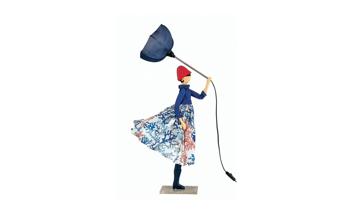 la lampada Koralia, realizzata a mano dall’artista greca Xenia, in legno con abiti in tessuto riciclato