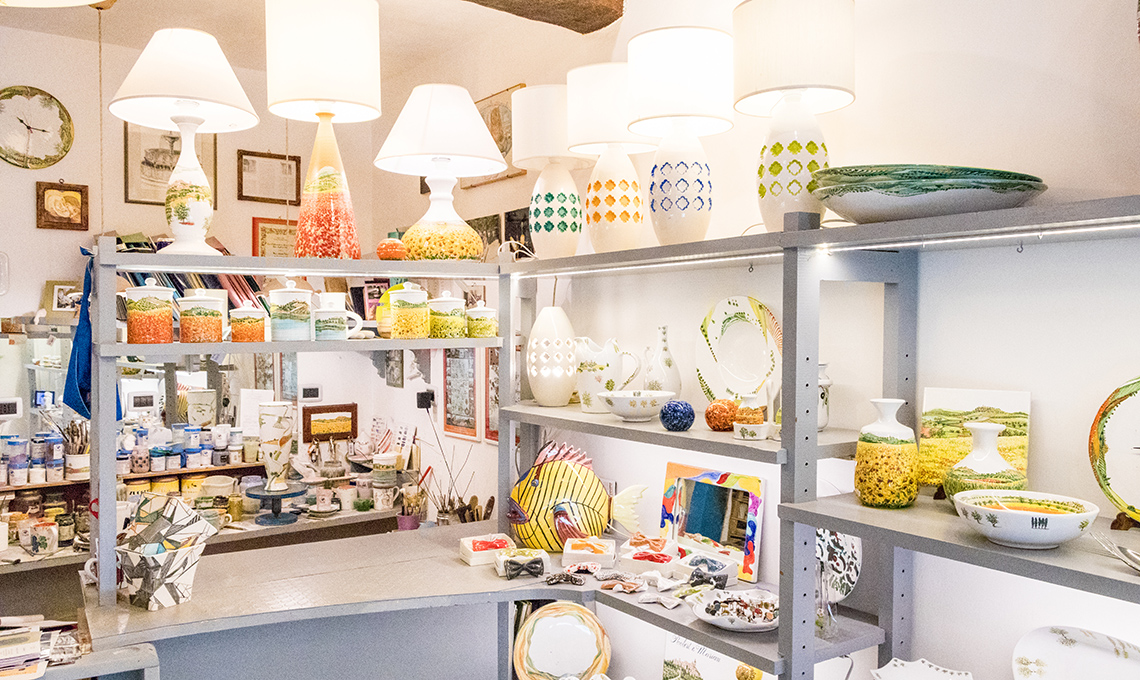 Storico laboratorio di lavorazione e vendita di ceramiche artigianali. Qui trovi le creazioni originali di Maria Antonietta Taticchi: vasi, piatti e lampade dipinte a mano, ma anche orecchini, collane e divertentissimi papillon.