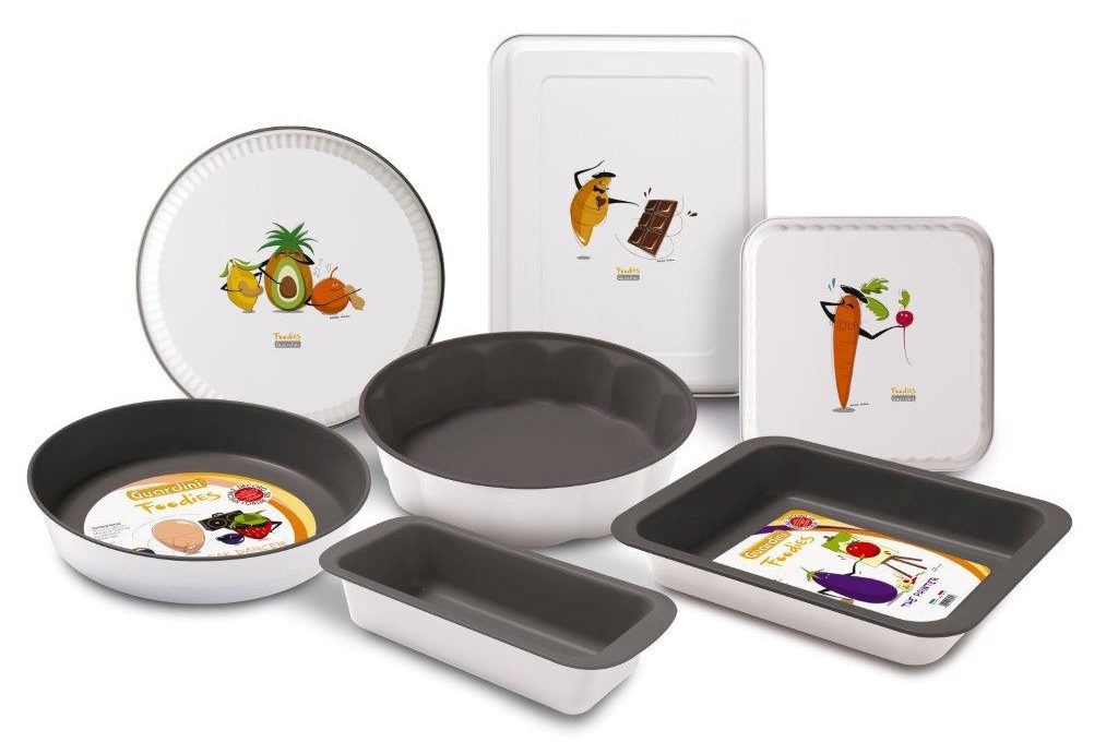 Foodies è la nuova linea di teglie da forno, di Guardini, con il retro vivacizzato da frutta, ortaggi, uova e cioccolato disegnati come simpatici artisti...ai fornelli