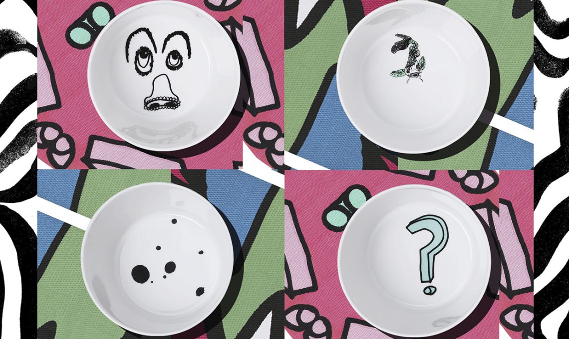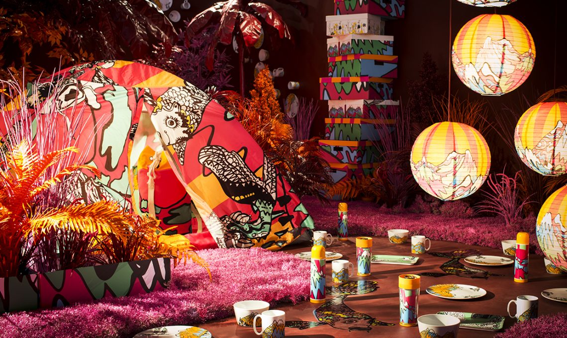 Quattro temi declinati in pattern e colori dal bianco e nero alle tonalità più brillanti, per la casa ma non solo: tende da campeggio, borsoni, lampade, scatole, tappeti, thermos, pouf giganti, cuscini, tazze e piatti ma anche t-shirt!