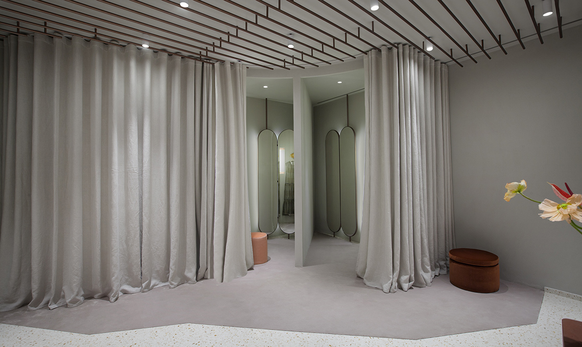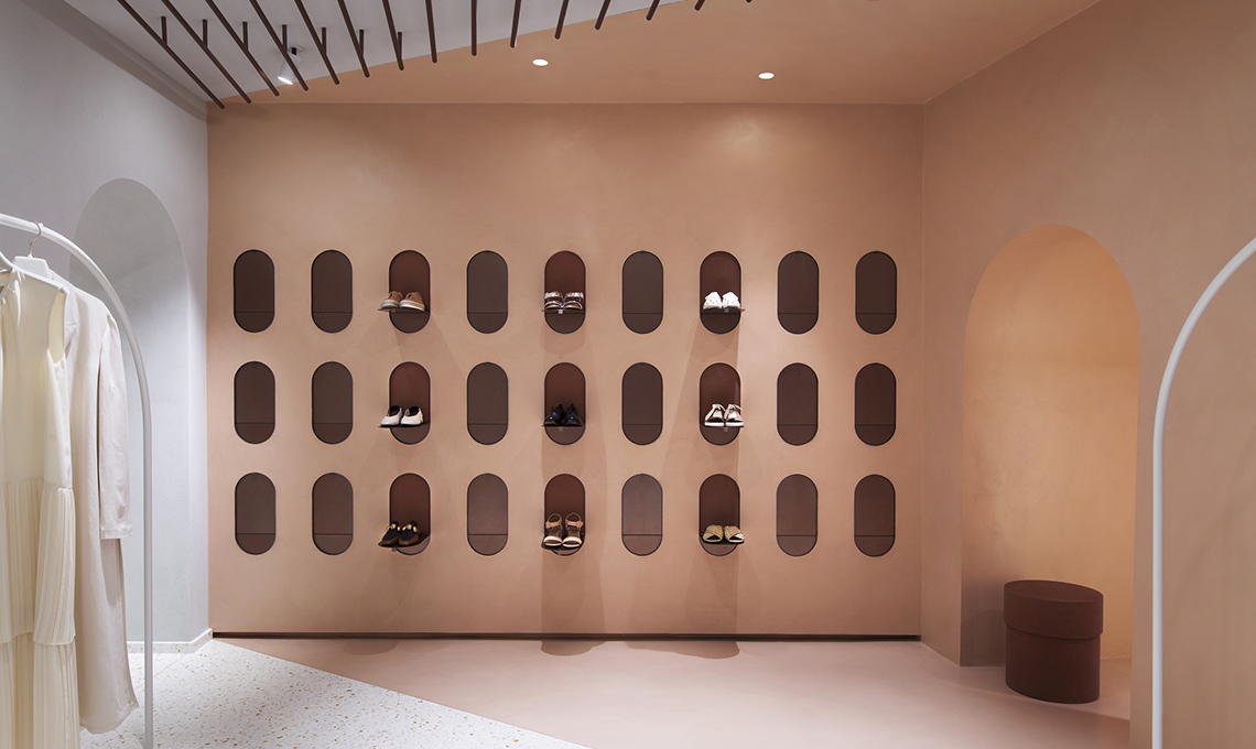 Studiopepe, lo studio di interior design e consulenza creativa, ha trasferito l’anima del brand negli interni, creando un’atmosfera sofisticata e contemporanea, con una palette di mezzi toni e tinte naturali che esaltano le collezioni senza sovrastarle. Un’estetica femminile e moderna crea un fil rouge tra i capi e gli ambienti.