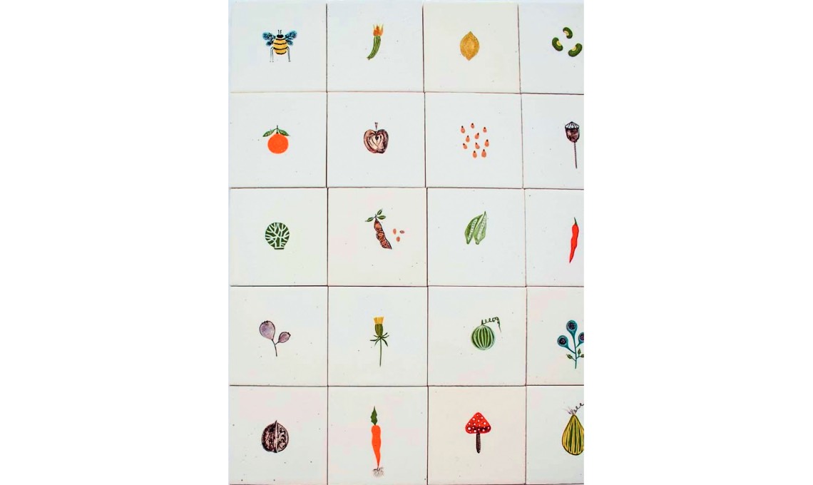 Sono pensati per la zona cucina i delicatissimi disegni stilizzati con soggetti in tema su fondo bianco. Ogni piastrella, realizzata a mano, misura cm 10x10 e ciascuna composizione ne conta 24. @nysaceramic