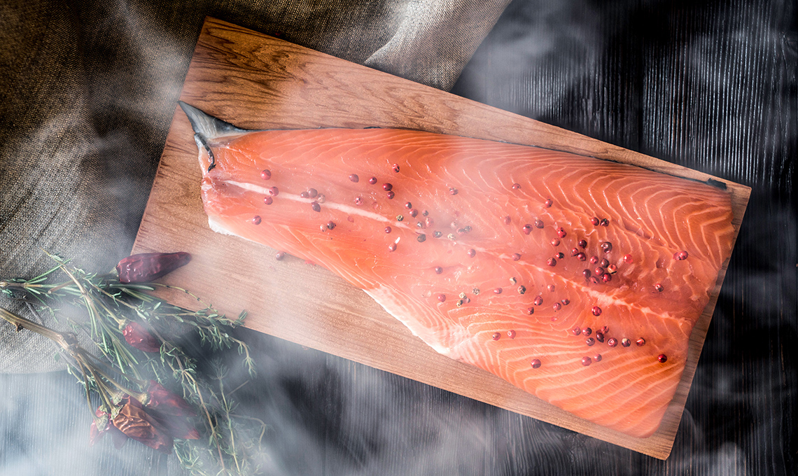 Ispirato al ‘planking’, antico metodo di cottura, il set creato ad hoc per cuocere e affumicare il salmone: tavola in legno di cedro più vassoio d’acciaio. ‘The Cedar Plank’ di KnIndustrie.
