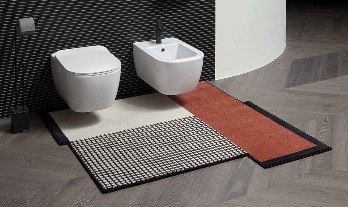 I tappeti della collezione Volumi sono adatti a qualunque ambiente, dal soggiorno al bagno, grazie alle linee geometriche realizzate in bianco e nero, con inserti in rosso terracotta.