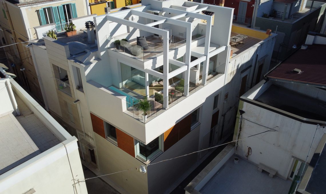 Casa SLD, in Puglia, è un progetto di m12 Architettura Design, ‘donato’ dal figlio ai propri genitori anziani: la casa si sviluppa in altezza (100 mq su 4 livelli collegati da un ascensore) e ha pure una piccola piscina e il solarium!
