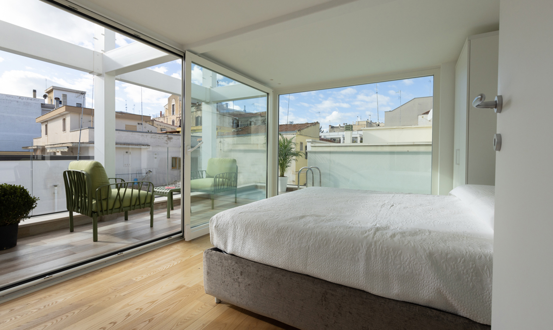 All’apice dell’edificio, la zona solarium. Le grandi aperture sui prospetti sono dotate di un particolare sistema a scorrimento rivestito in legno, che funge sia da sistema di sicurezza che da schermatura solare.