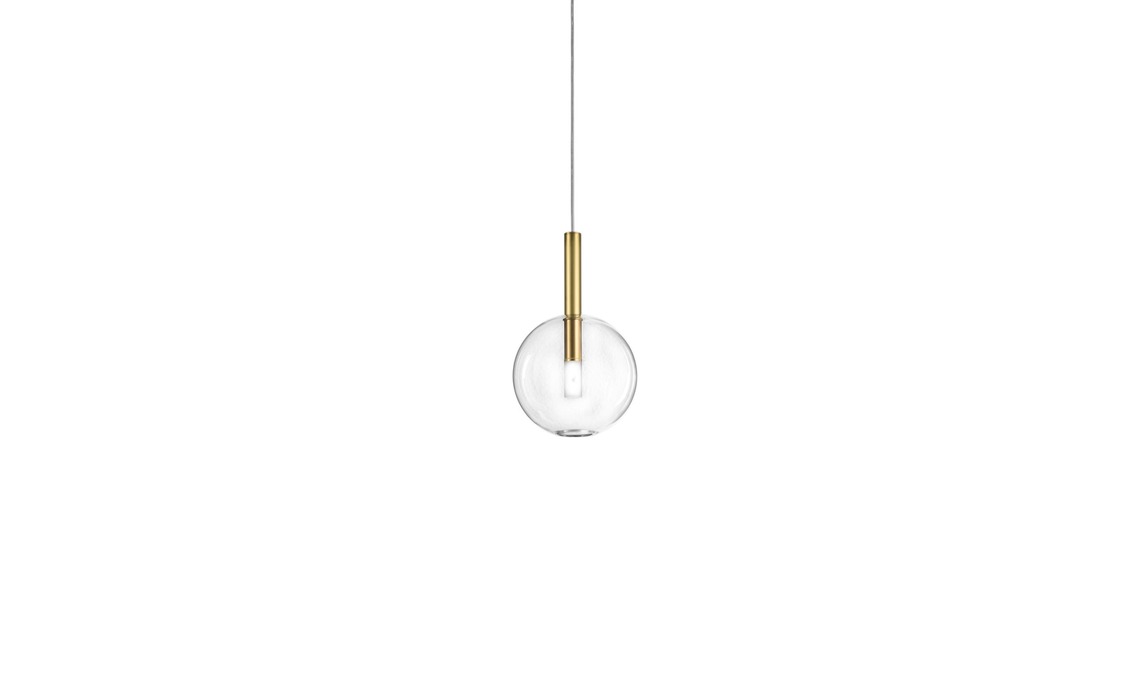 Una sfera di vetro avvolge il diffusore in ottone nella lampada Alchimia [Il Fanale, ø cm 18x33h].