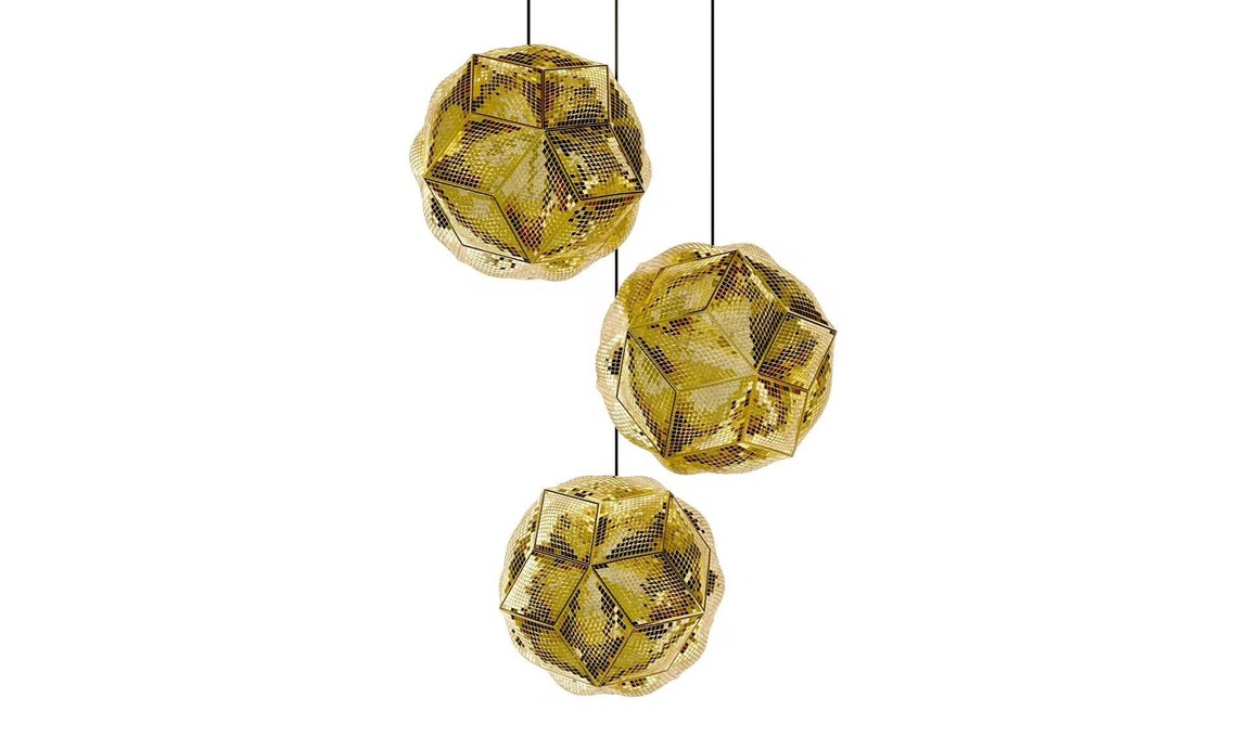 Una composizione di poliedri rivestiti di specchietti nel lampadario in metallo Puff System Trio [Tom Dixon, ø cm 88x206h].
