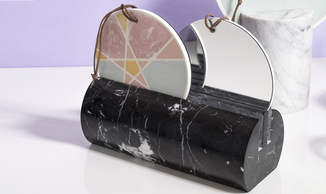 Set di specchi Poudre Duo, ispirati a quelli da borsetta: con retro in graniglia e base in marmo [Atelier Macramè, specchi ø cm 10, base cm 25x15h €840 il set].