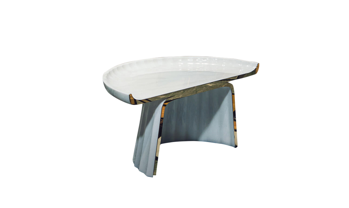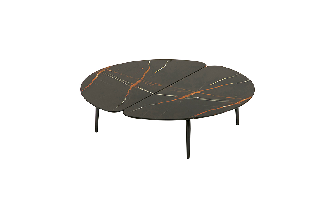 Graphium 682 è un tavolino basso in acciaio con piano in marmo Sahara Noir [Zanotta, cm 118x120x32,5h €3.697].