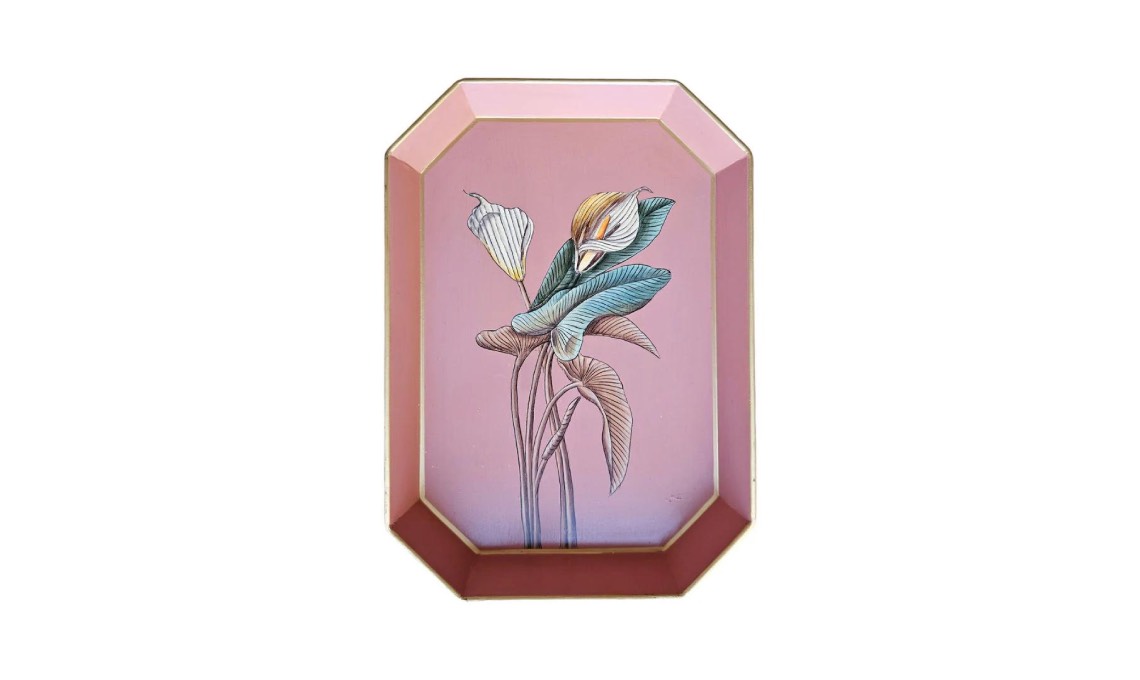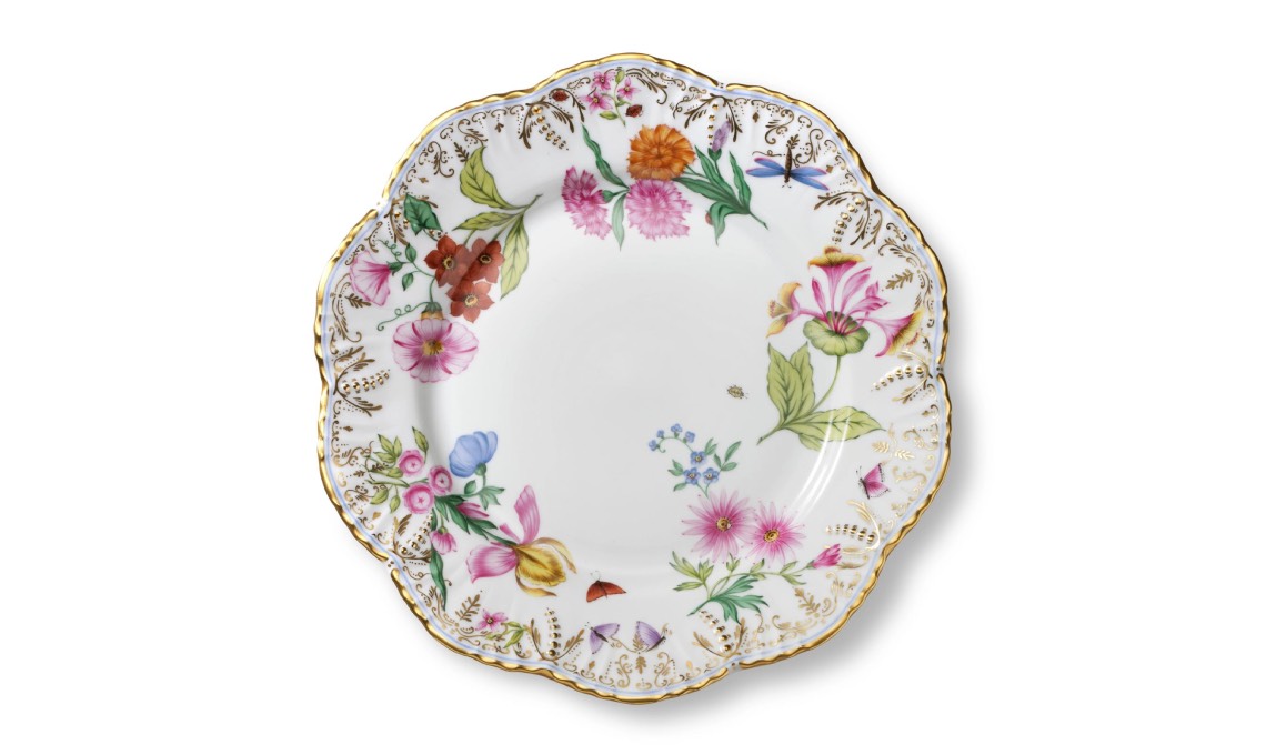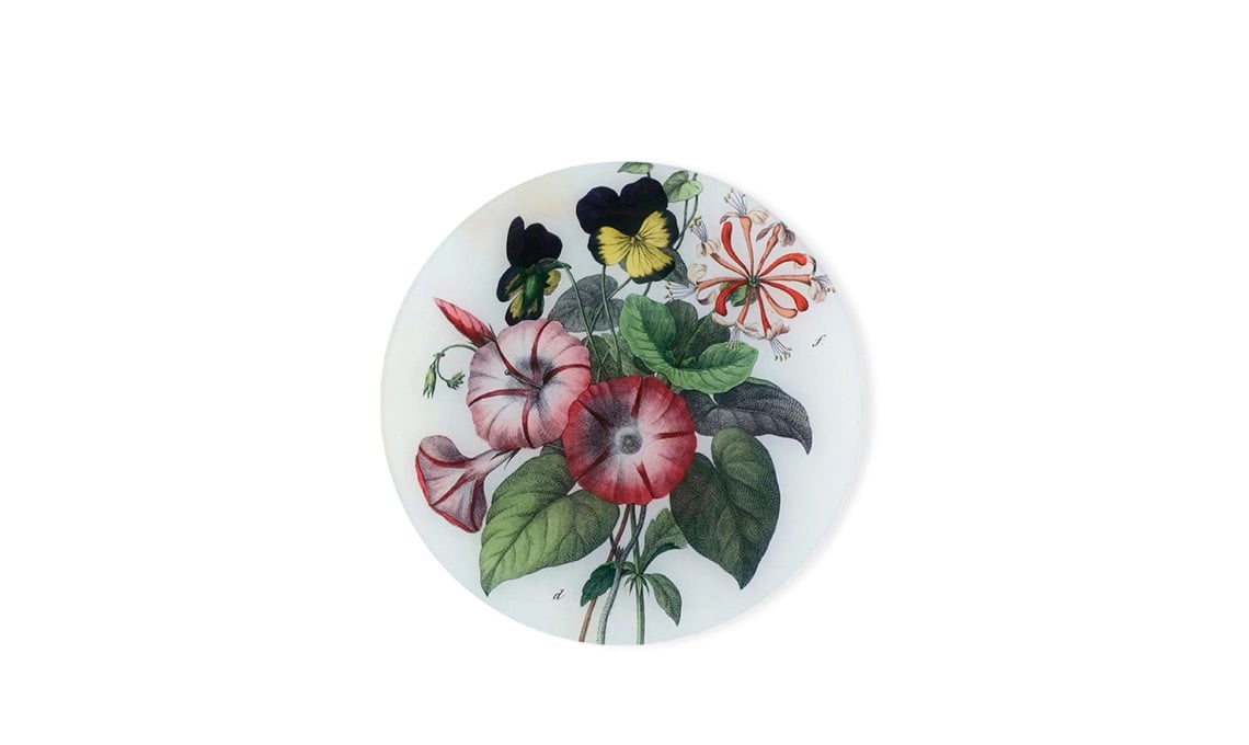 Un’antica stampa botanica ispira il piatto Pansy Honeysuckle, in vetro con découpage