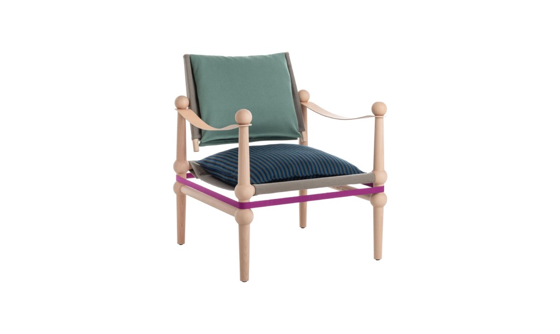 in chiave moderna la classica sedia safari la poltroncina Twain in massello di faggio, sedile e schienale inclinabile in tessuto e braccioli in cuoio [Magis, cm 67x67x83h].