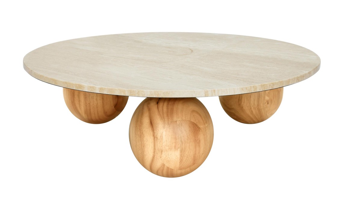 17. Scultoreo, il tavolino Gina ha il top in travertino e le ‘gambe’ in frassino biondo [NV Gallery, ø cm 80x25h].