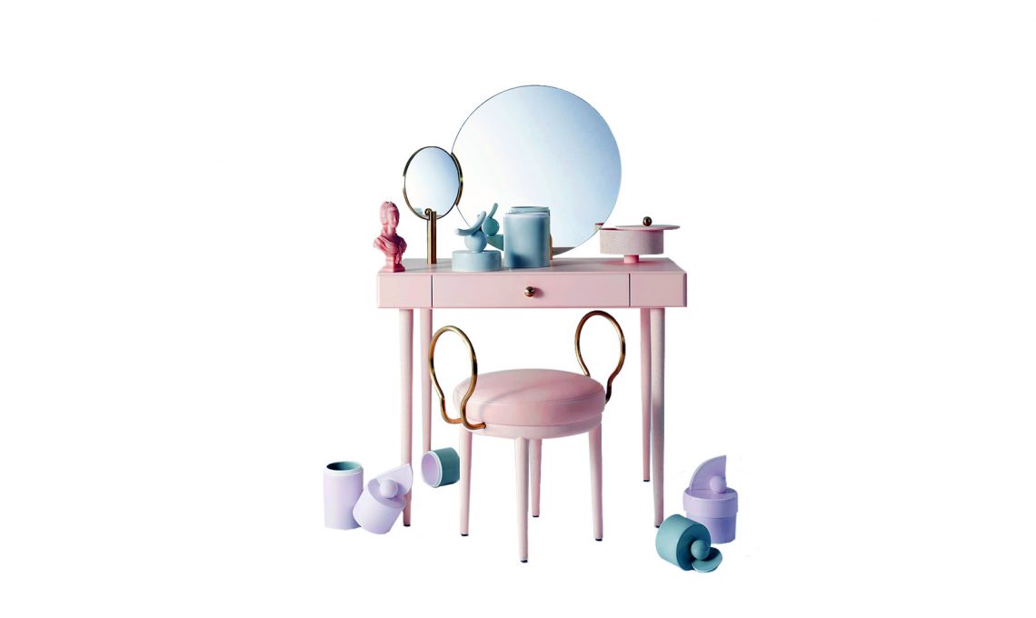 Un vero lusso da avere in camera, il vanity desk con sgabello Sélavy [Maisondada, cm 94x59x140h € 7.500].