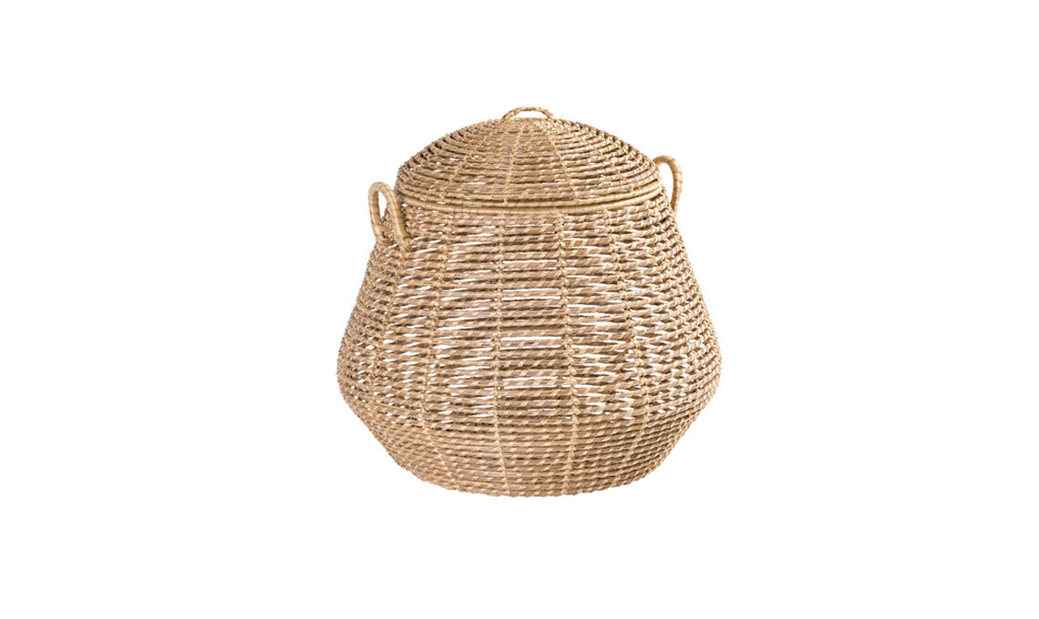 Dalla trama elegante, in vimini con dettagli in paglia nera o beige [H&M Home, ø cm 35x28h € 39,99].