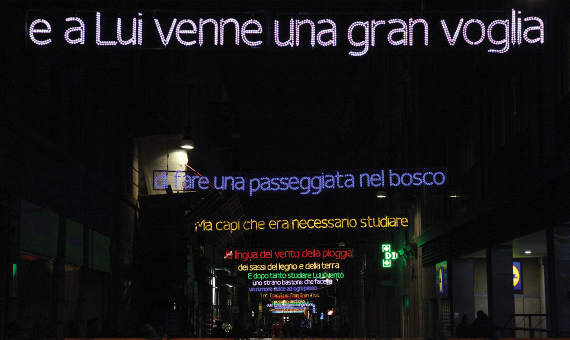'Luì e l’arte di andare nel bosco' è una vera e propria esperienza in divenire creata da LUIGI MAINOLFI: percorrendo Via Carlo Alberto si susseguono le colorate frasi che compongono la fiaba di Luigi Quarzo. La narrazione si svolge man mano che si passeggia arrivando alla fine della storia! È come leggere un libro in compagnia camminando tranquillamente.